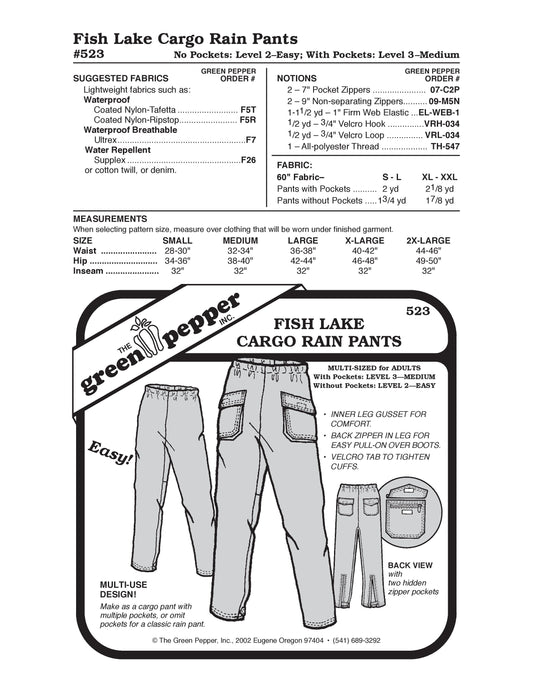 フィッシュ レイク カーゴ レイン パンツ パターン (1 個あたりの販売)