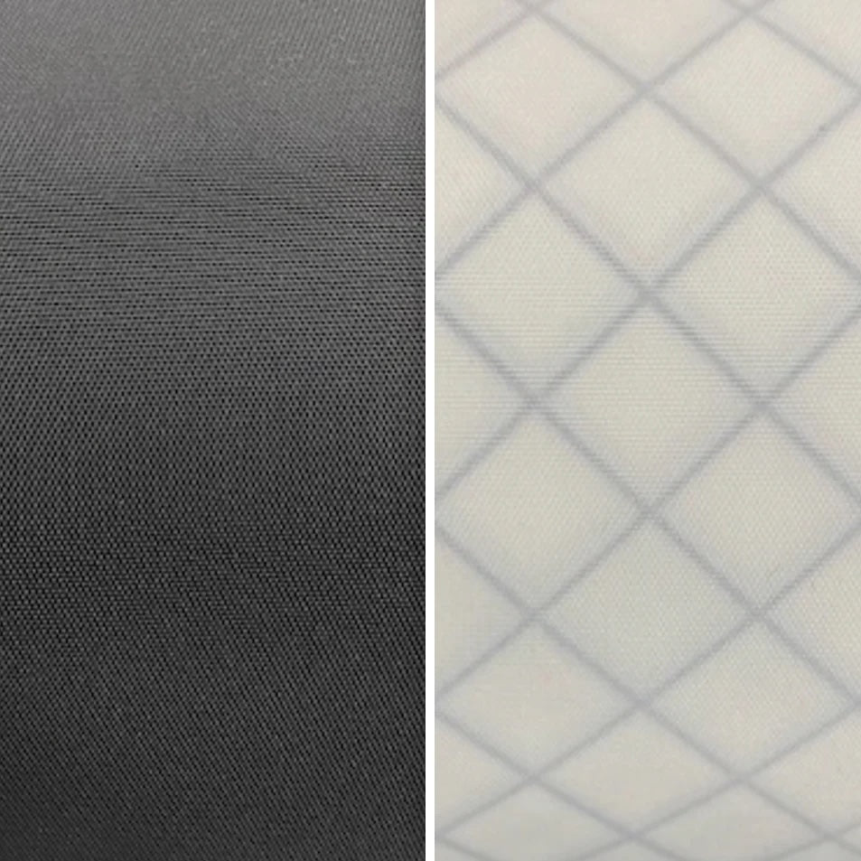 Challenge ECOPAK は、リサイクルされた表面生地、45 度で挿入されたリサイクルされた青い CrossPly 糸、環境に優しい C0 DWR を備えたリサイクルされた白い 70d リップストップ裏地を備えた多層構造です。