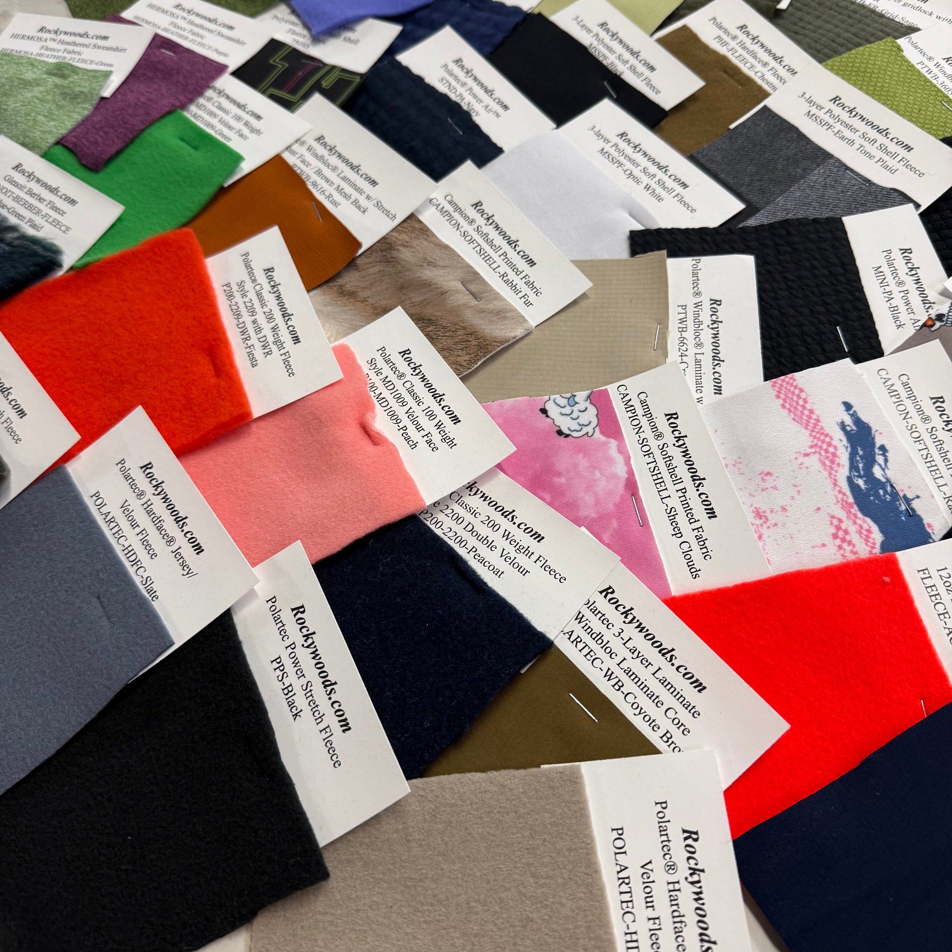 当社が取り扱うすべてのフリースのサンプル: 100、200、300、Windbloc、Windpro。ソフトシェルは含まれません。約40サンプル