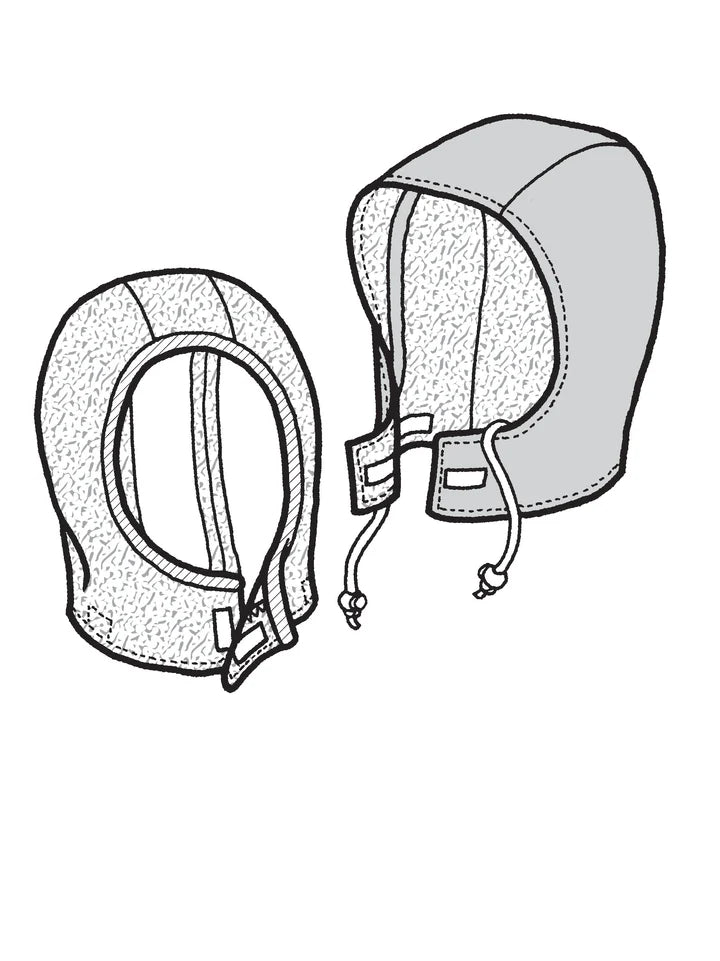 This detachable hood pattern can be used to make a warm lined hood for children that can be conveniently attached with Velcro to any existing jacket. Make a lined waterproof hood that has a drawstring, or a fleece hood with bound edges. The fleece hood can also be worn as a helmet liner. The front attaches at the throat with Velcro. Add it to any coat or jacket that you made or that is ready-to-wear. Perfect addition to our patterns: 114 Children's Jogging Suit or 509 Kid's Polar Jacket.