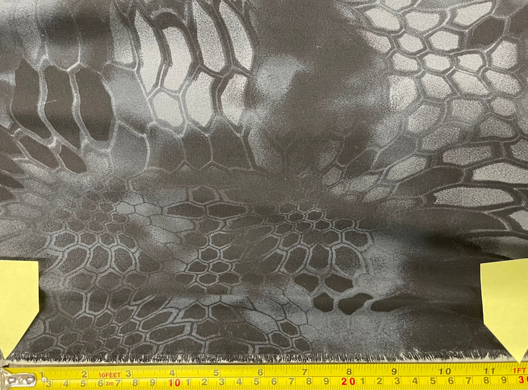 This is a lightweight nylon/spandex fabric printed in Kryptek Typhon camouflage. There is a decent amount of 4-way stretch in the fabric, making it a nice fabric for running or cycling shorts, hiking shorts, or any garment where you want a bit of stretch and breathability. Excellent DWR finish to repel stains and water.